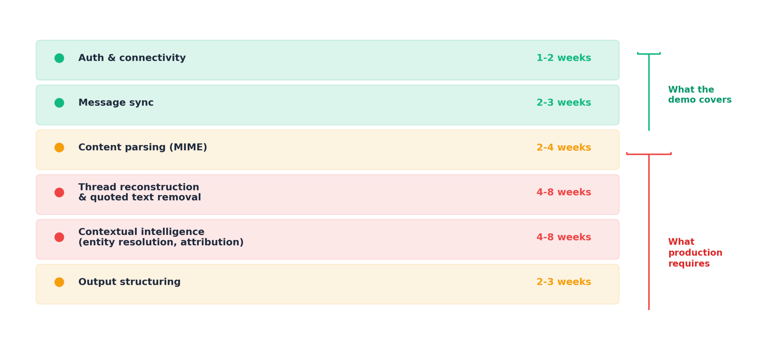 Then content parsing, thread reconstruction, entity resolution, and output structuring take another 12-24 weeks, because every new inbox reveals new quoting formats (Gmail uses “>” prefixes, Outlook uses styled div blocks, Apple Mail uses blockquote tags, mobile clients sometimes embed quotes as plain paragraphs with no structural markers), threading edge cases, and entity resolution problems that don’t throw errors but silently degrade output quality.