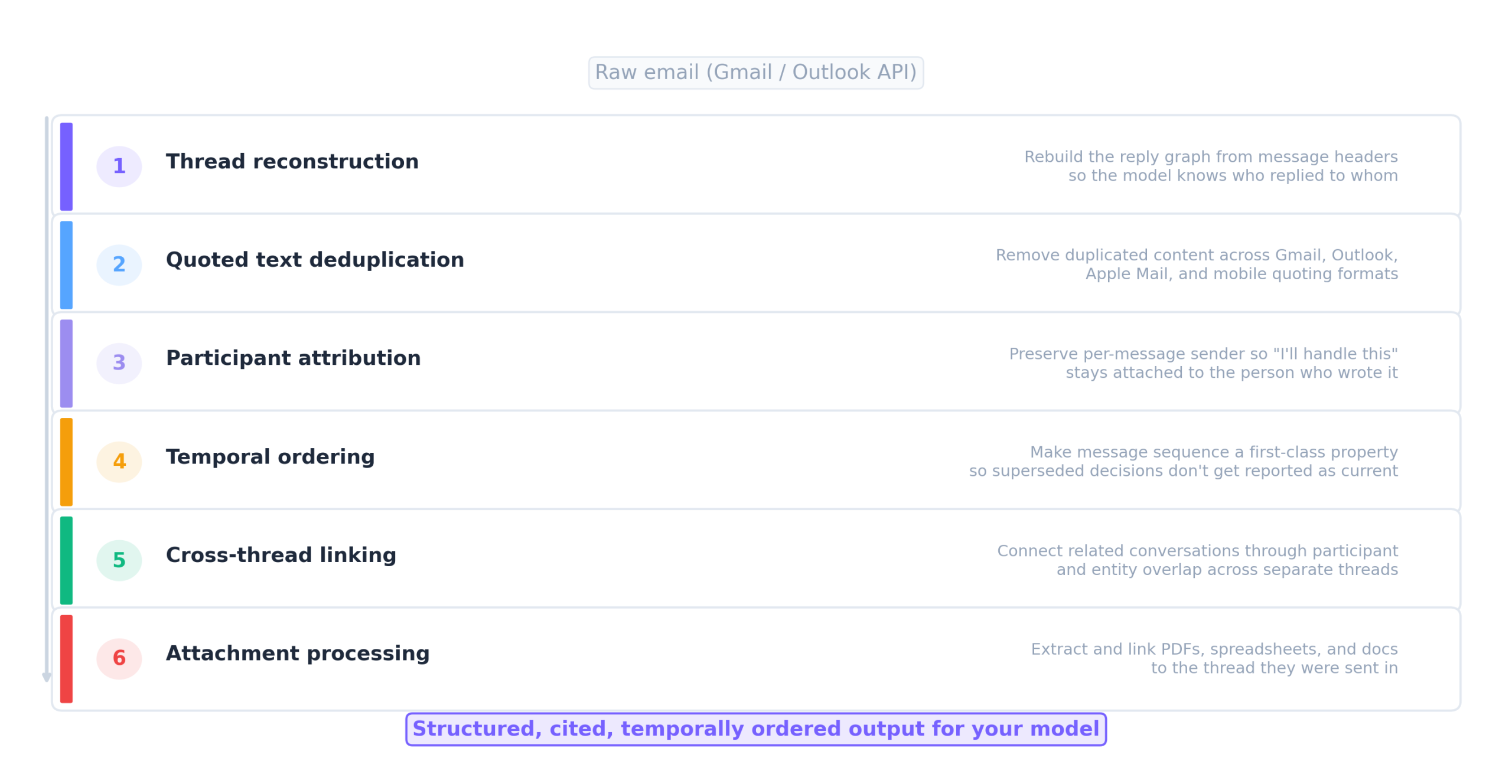 These aren’t edge cases. They’re structural properties of email as a data format, and handling them requires six infrastructure layers between the raw Gmail or Outlook API and accurate model output: thread reconstruction, quoted text deduplication, participant attribution, temporal ordering, cross-thread linking, and attachment processing.