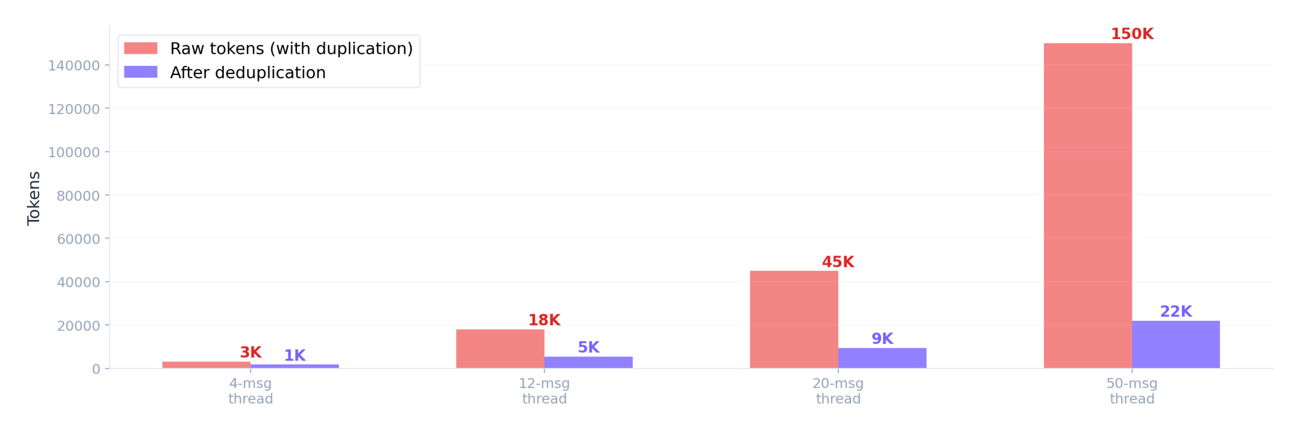 There’s also a hidden LLM inference cost. Raw email content from the Gmail API contains 4-5x token bloat from nested quoted text. A 20-message thread might produce 45,000 tokens of raw content but only contain 9,000 tokens of unique content. Deduplication before reasoning cuts inference cost proportionally.