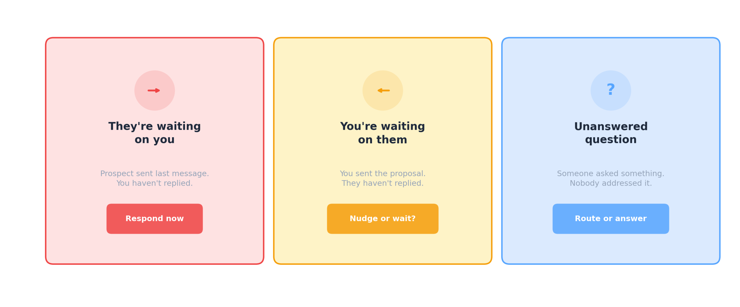 CRM task creation. Write they_are_waiting items into Salesforce or HubSpot as follow-up tasks with the contact name, the specific question, and the number of days waiting. The rep has context to respond without re-reading the thread.