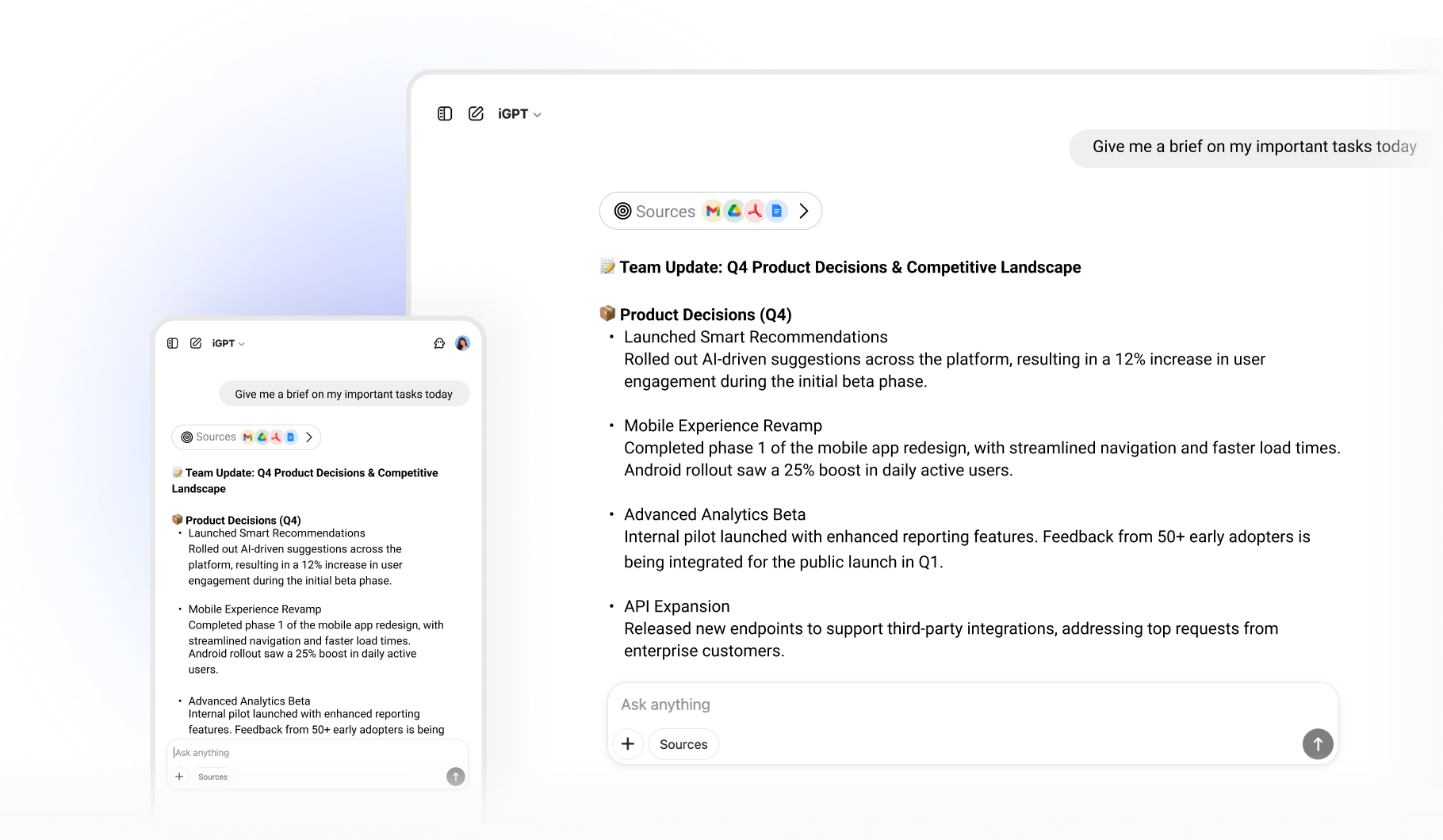 Use iGPT on web, desktop, and mobile. Your context syncs across every device.